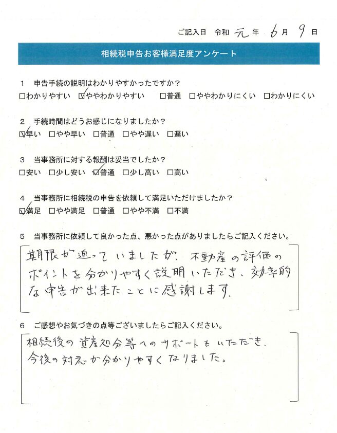 期限が迫っていましたが、不動産の評価のポイントを分かりやすく説明いただき、効率的な申告ができたことに感謝します。