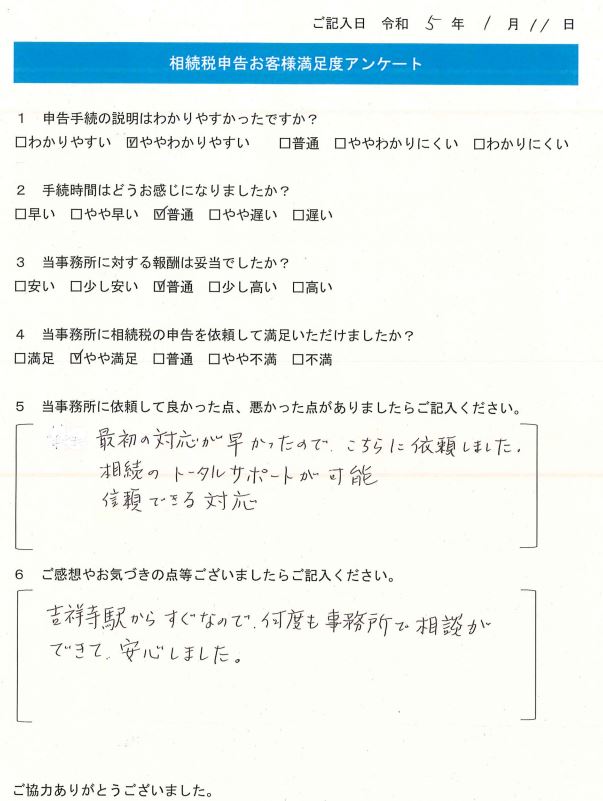 吉祥寺駅からすぐなので、何度も事務所で相談ができて、安心しました。