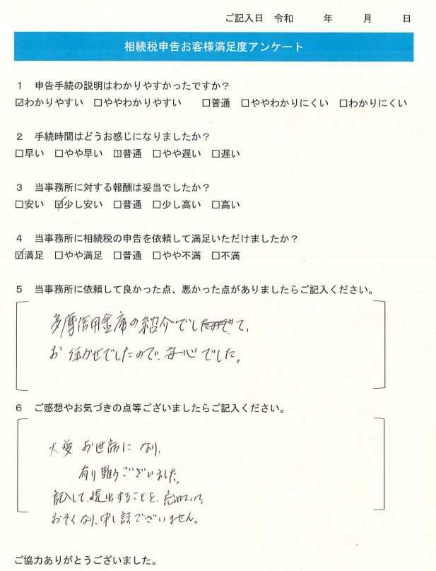 多摩信用金庫の紹介でして、お任せでしたので、安心でした。