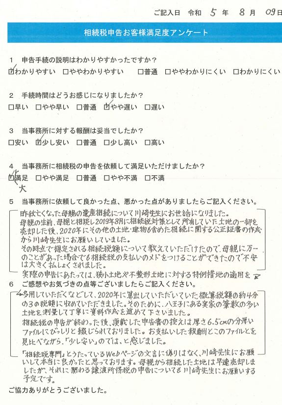 「相続税専門」とうたっているWebページの文言に偽りはなく、川﨑先生にお願いして本当に良かったと思っております。母親から相続した土地は早速売却しましたが、それに関わる譲渡所得税の申告についても川﨑先生にお願いする予定です。