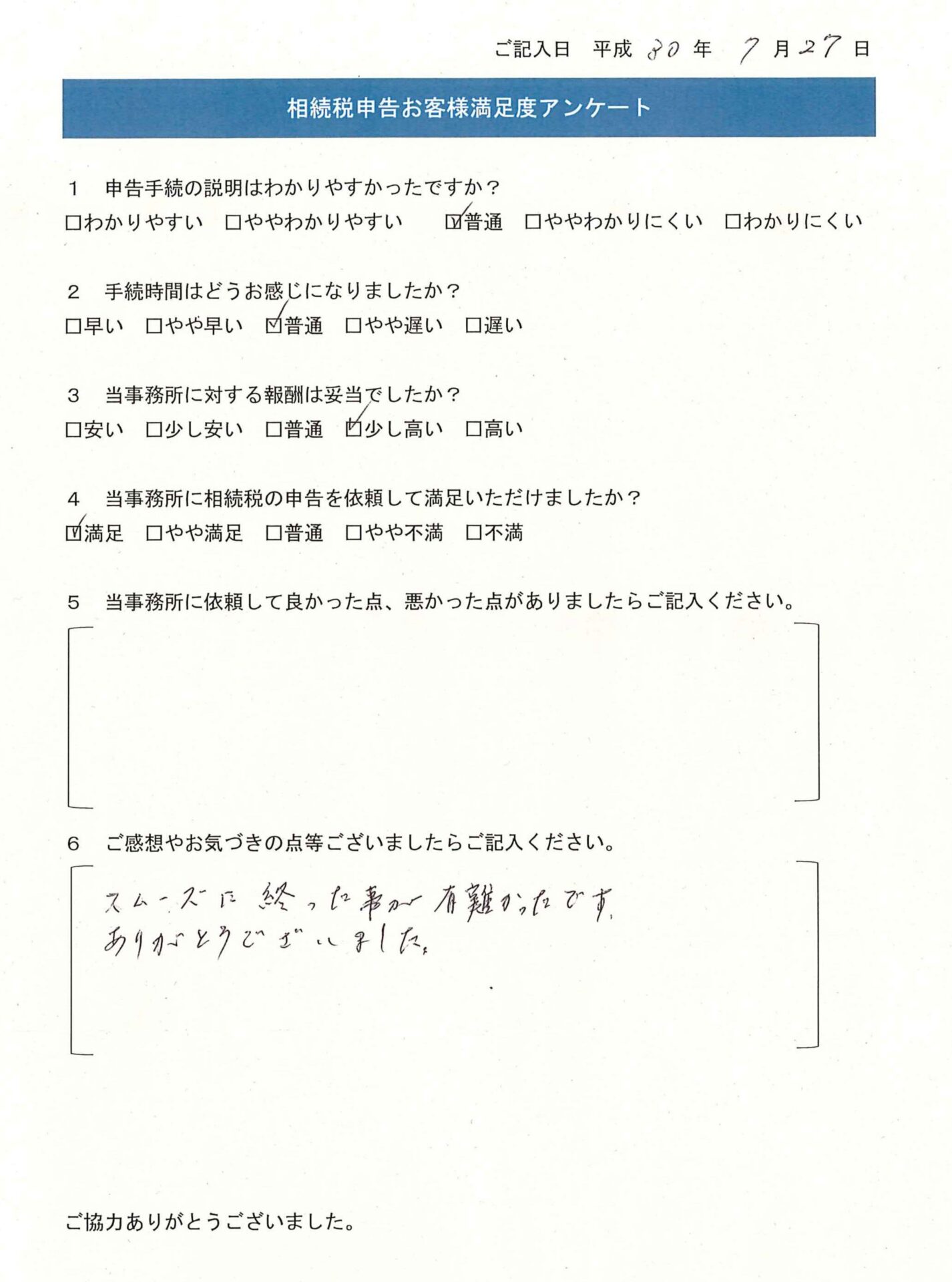 スムーズに終った事が有難かったです。ありがとうございました。
