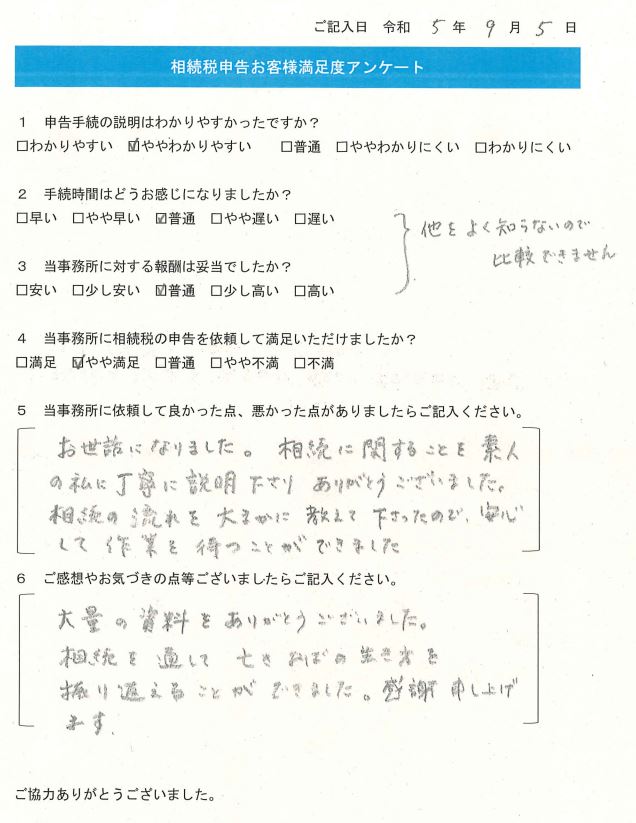 お世話になりました。相続に関することを素人の私に丁寧に説明下さりありがとうございました。