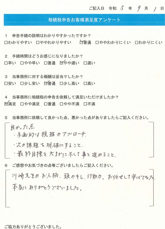 川﨑先生のお人柄、頭のキレ、行動力、お任せして安心でした。
