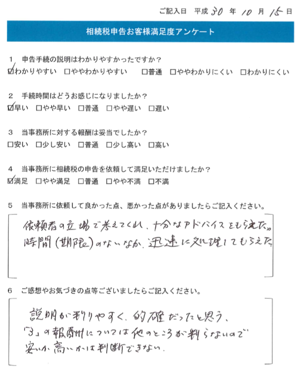 時間(期限)のないなか、迅速に処理してもらえた。