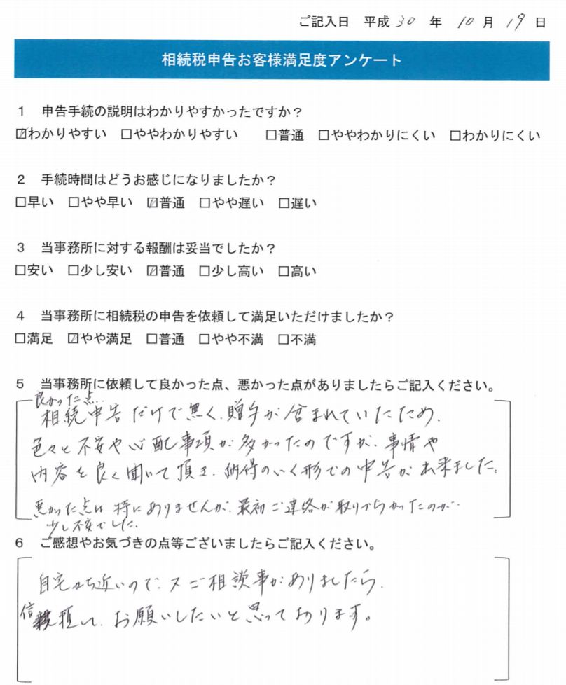良かった点 相続申告だけで無く、贈与が含まれてたため、色々と不安や心配事項が多かったのですが、事情や内容を良く聞いて頂き、納得のいく形での申告が出来ました。悪かった点は特にありませんが、最初ご連絡が取りづらかったのが少し不安でした。