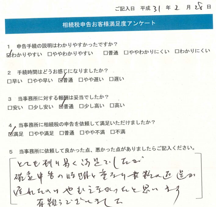 とても判り易いご対応でしたが、確定申告の時と重なり書類の返還が遅れたのはやむえなかったと思います