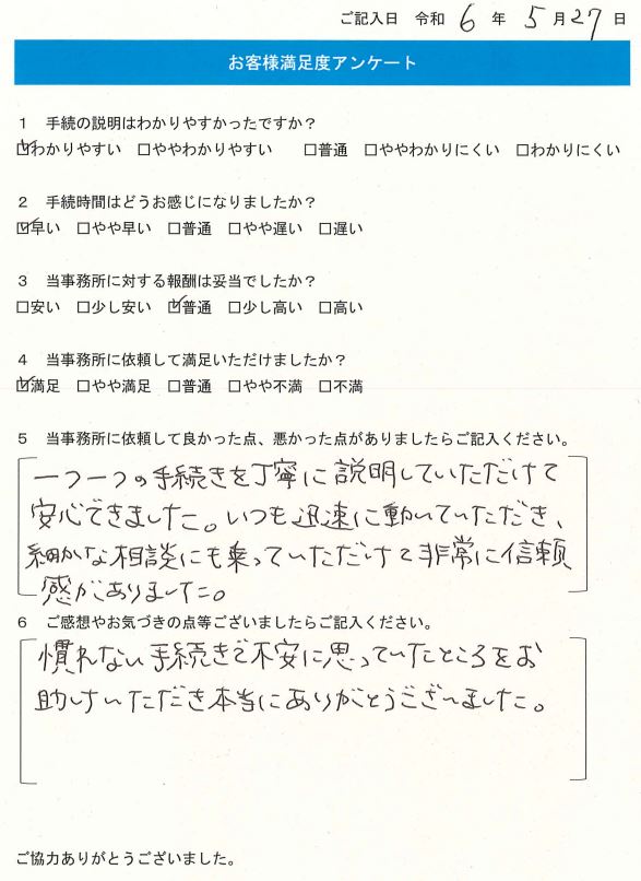 一つ一つの手続きを丁寧に説明していただけて安心できました。いつも迅速に動いていただき、細かな相談にも乗っていただけて非常に信頼感がありました。