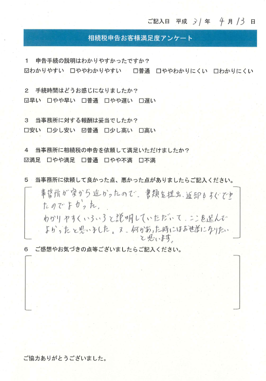 わかりやすくいろいろと説明していただいて、ここを選んでよかったと思いました。又、何かあった時にはここにお世話になりたいと思います。