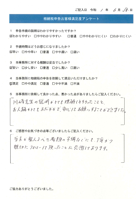 当方が整えるべき書類の不備などにも、丁寧かつ親切にフォローして頂いたことに感謝しております。