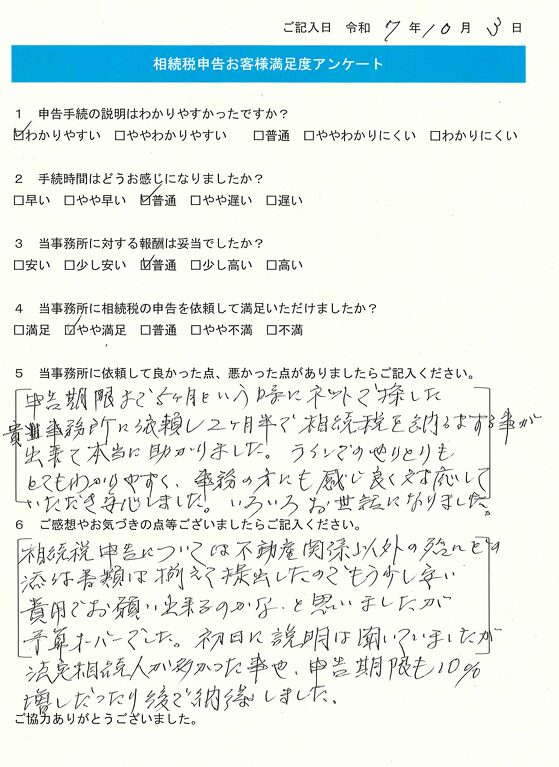 貴事務所に依頼し、2か月半で相続税を納付する事が出来て本当に助かりました。(2025年10月3日杉並区・女性)