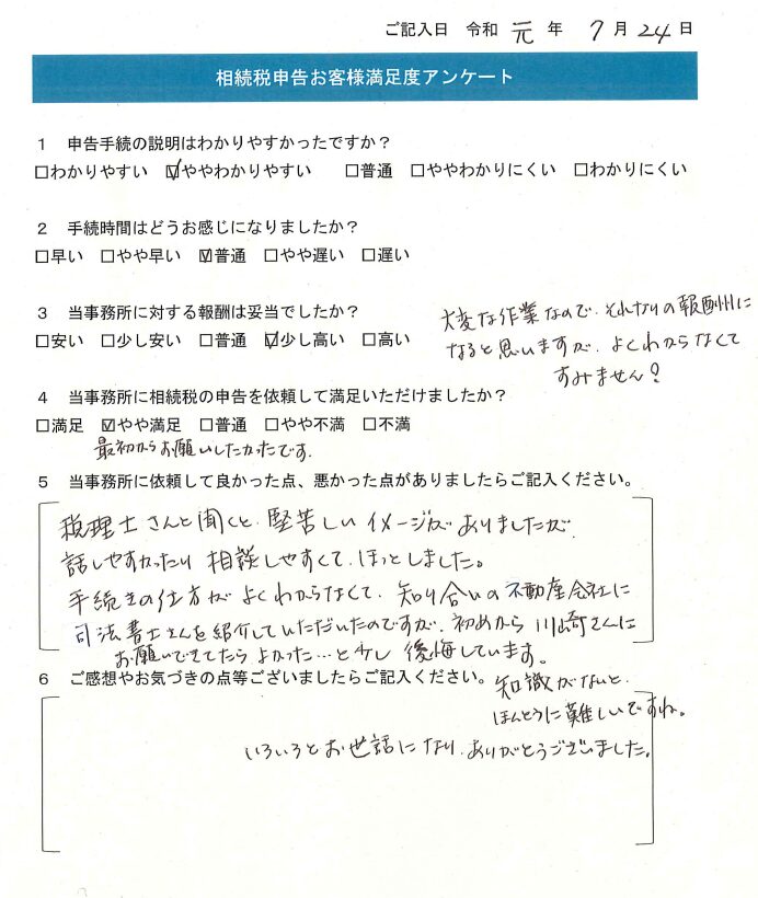 手続きの仕方がよくわからなくて、知り合いの不動産会社に司法書士さんを紹介していただいたのですが、初めから川崎さんにお願いできてたらよかった…と少し後悔しています。