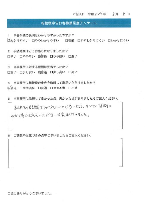 初めての経験でわからないことが多いところ、全ての質問にわかり易くお応えいただき、大変助かりました。