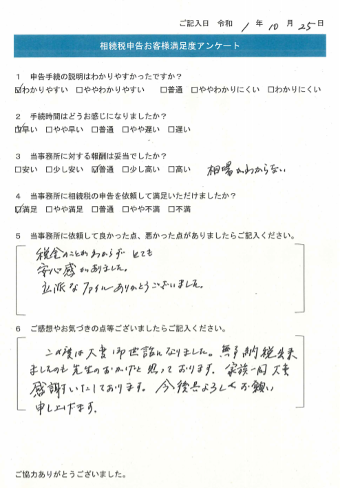 無事納税出来ましたのも、先生のおかげだと思っております。