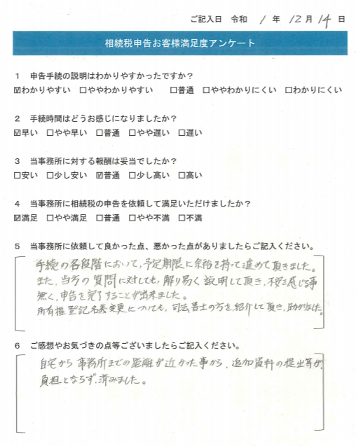 手続きの各段階において、予定期限に余裕を持って進めて頂きました。