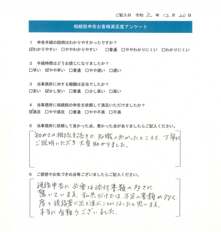 税務申告に必要な書類の多さに驚いています。私共だけでは不足の資料が多く、度々税務署に足を運ぶことになったと思います。本当に有難うございました。