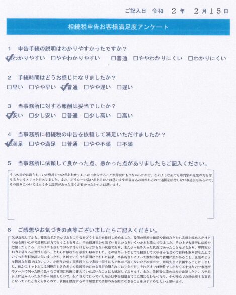 父が急死してから、葬儀などが済んであとに申告をどうするかを検討し始めました。役所の税理士相談や親戚などから書類を埋めるだけとの話を聞いたので最初は自力で行うことを考え、中央経済社から出ているものなどいくつか本も読んでみました。その上で大雑把に状況を把握したところ、父がメモも残しておらず母もほとんど知らない状態であり、また少々込み入った状況であったことなどもあり、専門家のお力を借りる必要性を感じ、どちらに頼むかを検討し始めました。その後ネットなどでも検索して大手さんも含めて資料を取り寄せた上でいくつか無料相談に伺いましたが、各所でいくつか質問などをした結果、事務所さんによって数割の幅で費用に差があること、企業のような複雑な財務ではないこと、小回りの効く事務所さんで家族で伺うにもそれほど遠くないなどの理由で、川﨑先生に依頼することにしました。確かにネット上には国税庁も含め多くの相続税向けの文書が公開されておりますが、それだけでは断片でしかなく不十分なので事務所やメールで伺った際に色々なご質問に的確に答えていただいたことにも感謝しております。また、依頼後に家の状況を確認したところ予想以上に込み入った点が多々発生したので、仮に自力で行っていた場合は申告期限までには間に合わなくなり、その時点で急遽依頼する事態となっていたと考えられるので、依頼を検討するのは期限まで余裕のある間になさることをおすすめしたいと思います。