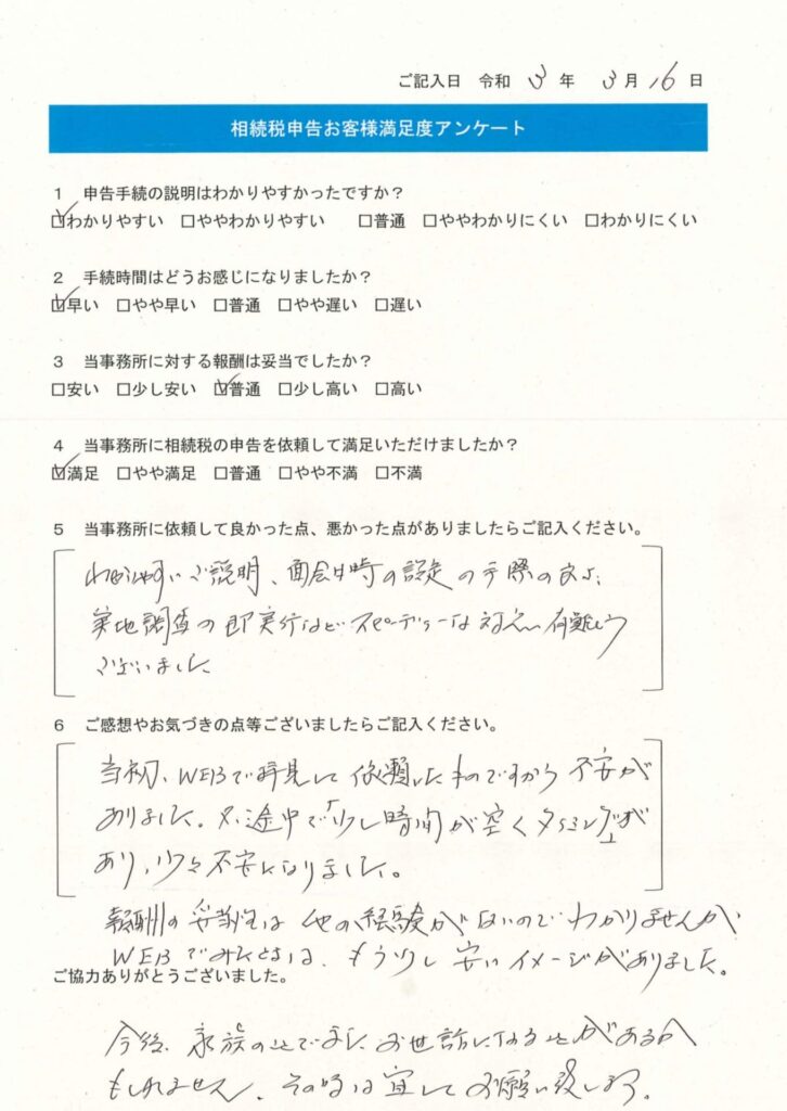 わかりやすいご説明、面会日時の設定の手際の良さ、実地調査の即実行などスピーディーな対応有難うございました