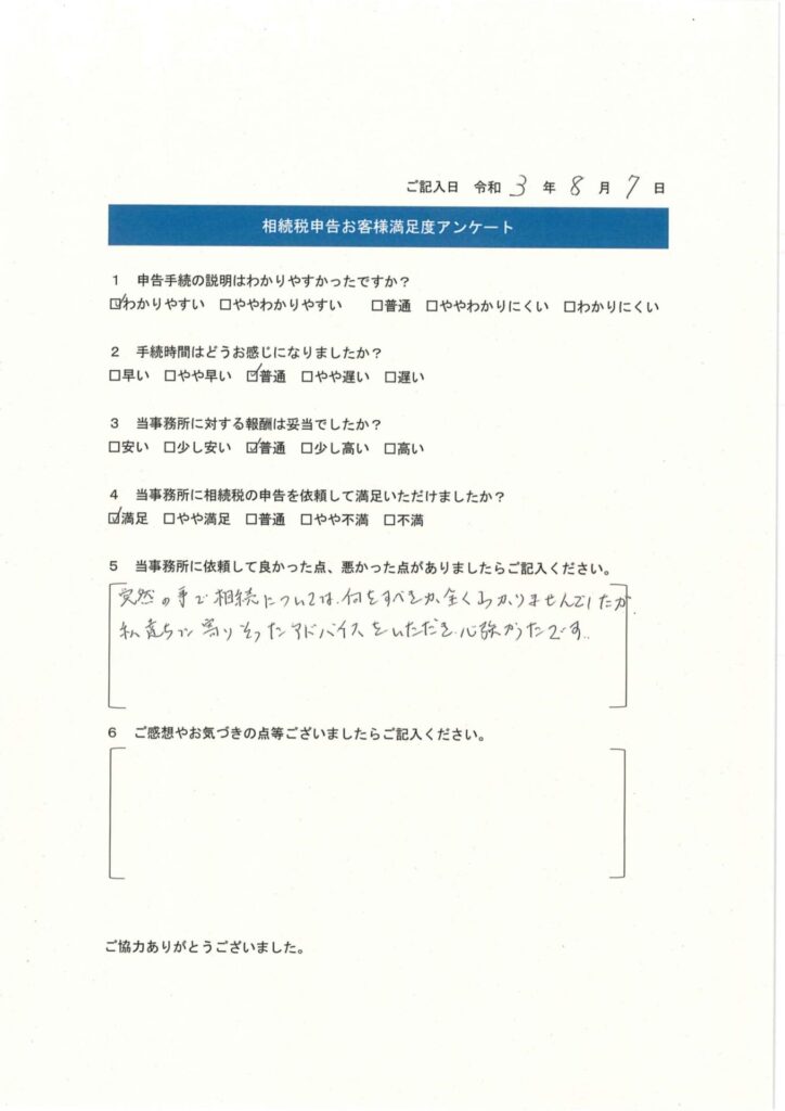 突然のことで、相続については何をすべきか全くわかりませんでしたが、私たちに寄り添った
