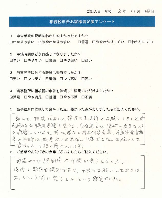 特に、過去の贈与対象有無、名義預金有無等の判断は、私達では出来ない内容でした。お願いして良かったと強く感じています。