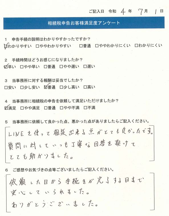 依頼した日から手続きが完了する日まで安心していられました。ありがとうございました。
