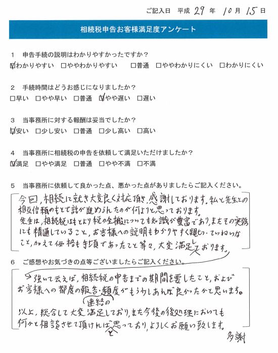 先生は、相続税はもとより税の全般についても知識が豊富であり、またその実務にも精通していること、お客様への説明もわかりやすく親切・ていねいなこと、加えて価格も手頃であったこと等々、大変満足しております。強いて云えば、相続税の申告までの期間を要したこと、およびお客様への都度の報告・連絡の頻度がもう少しあれば良かったかと思います。