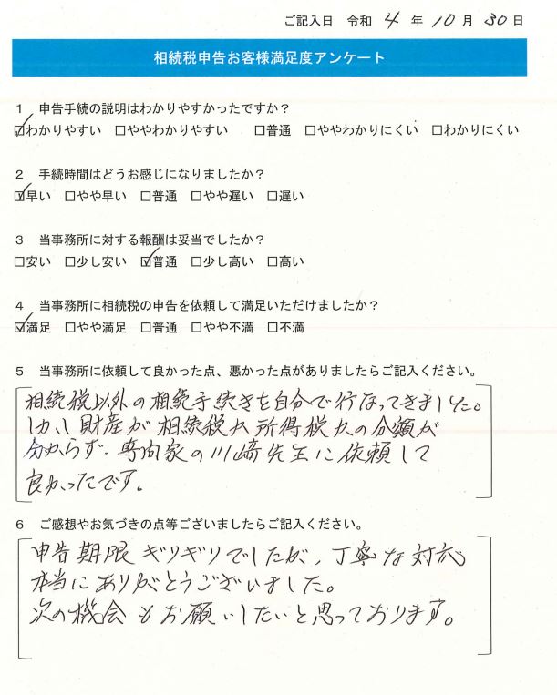 しかし、財産が相続税か所得税かの分類が分からず、専門家の川﨑先生に依頼して良かったです。