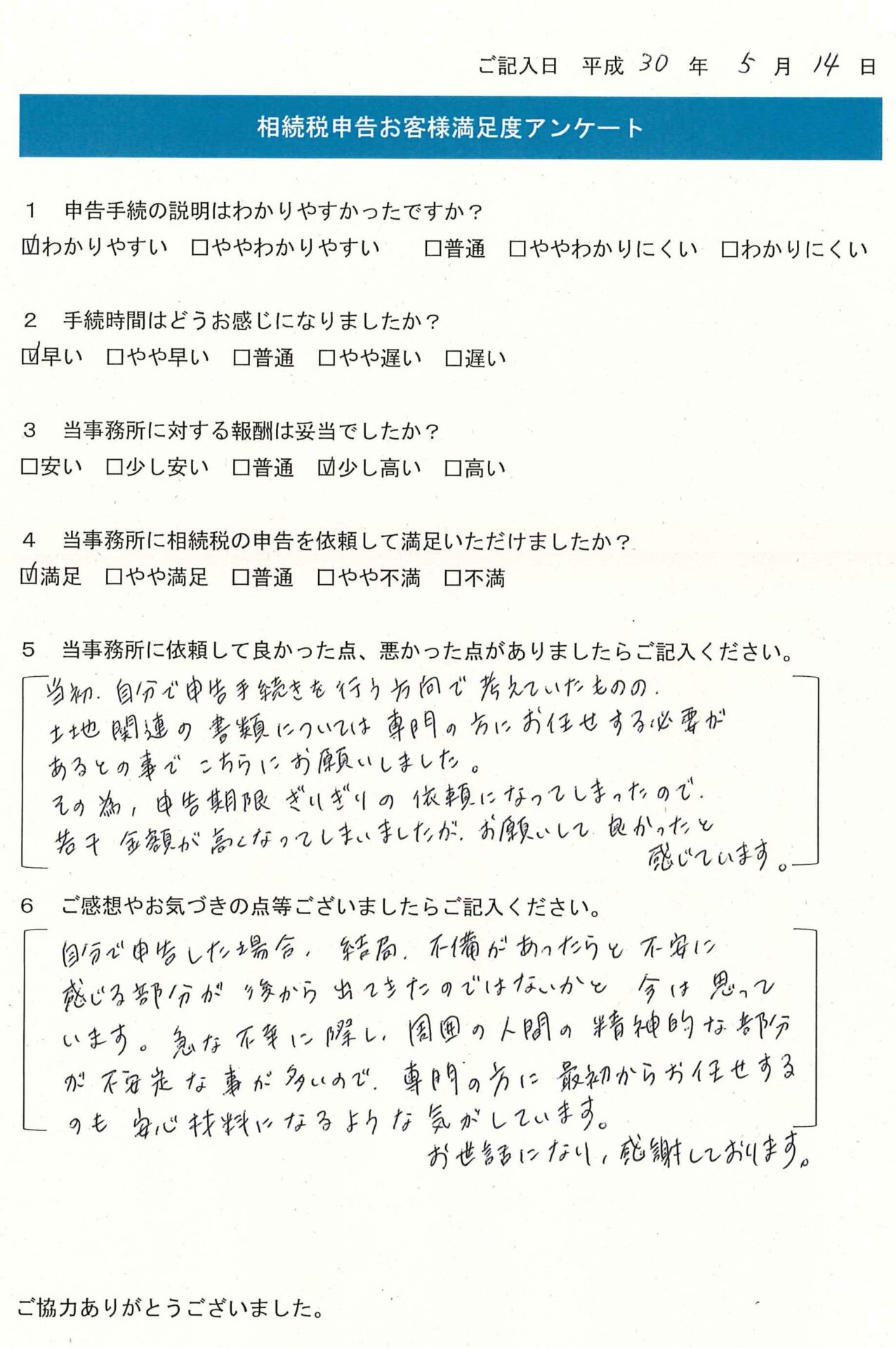 自分で申告した場合、結局、不備があったらと不安に感じる部分が後から出てきたのではないか、今は思っています。急な不幸に際し、周囲の人間の精神的な部分が不安定な事が多いので、専門の方に最初からお任せするのも安心材料になる気がしています。お世話になり、感謝しております。