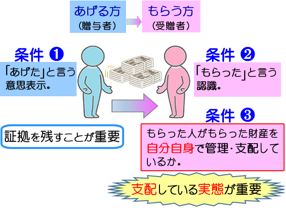 [条件③]★もらった人がもらった財産を自分自身で管理・支配しているか。支配している実態が重要 となります。