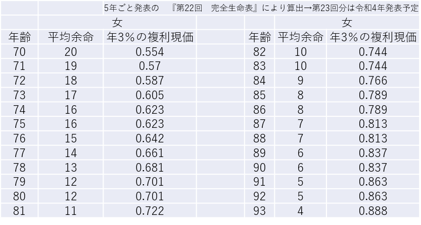 【年齢ごとの女性の平均余命及び複利現価率】